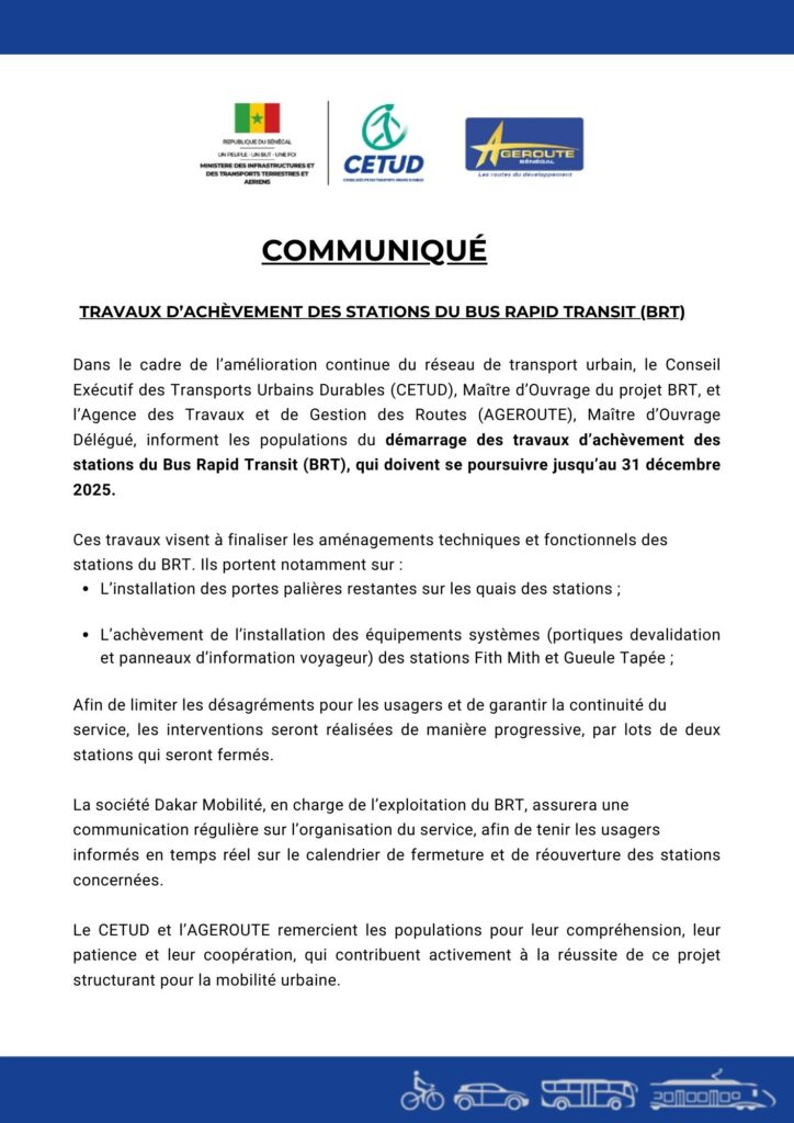 Le CETUD, maître d’ouvrage du projet BRT, et l’AGEROUTE, maître d’ouvrage délégué, informent le public du démarrage des travaux d’achèvement des stations du BRT, prévus jusqu’au 31 décembre 2025.